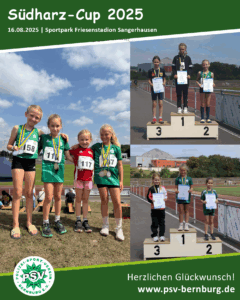 Am 16. August 2025 fand der erste Wettkampf nach den Ferien für unsere Jüngsten statt. In Sangerhausen zum Südharz-Cup konnten sie sich über eine großartige Ausbeute an Medaillen freuen. So belegte unsere jüngste Leichtathletin Elaina Ebeling den 4. Platz im Finale über 30 m und im Weitsprung der Altersklasse 6. Einen ganzen Medaillensatz konnte Laura Böckel sammeln, mit dem ersten Platz im Sprint, dem zweiten Platz im Weitsprung und dem dritten Platz im Schlagballwurf der Altersklasse 8. In der Klasse der neunjährigen freute sich Emilia Ebeling über zweimal Silber im Sprint über die 50 Meter und im Weitsprung. Ähnlich groß ...